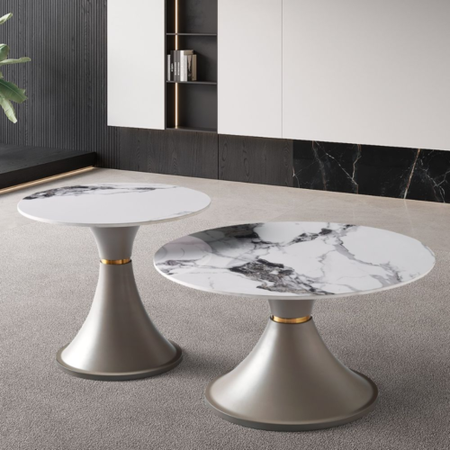 V05 – Modern Dual Round Coffee Table Set – Marble-Effect Slate Top with Luxury Iron Base for Living Room