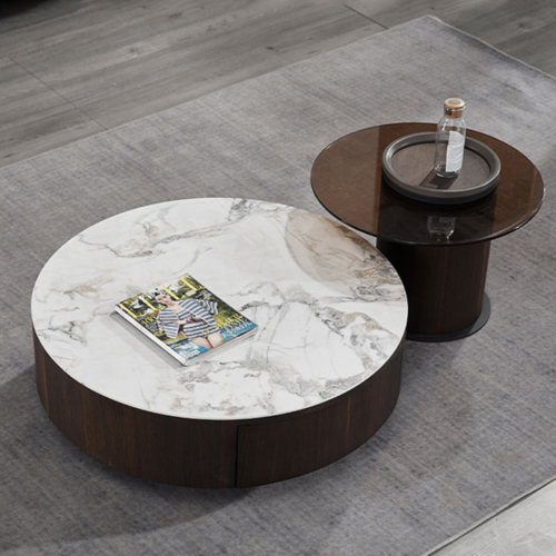 Y07 – Modern Pair Round Coffee Table Set – Glass & Marble-Effect Rock Slab Tops with Iron Base for Living Room