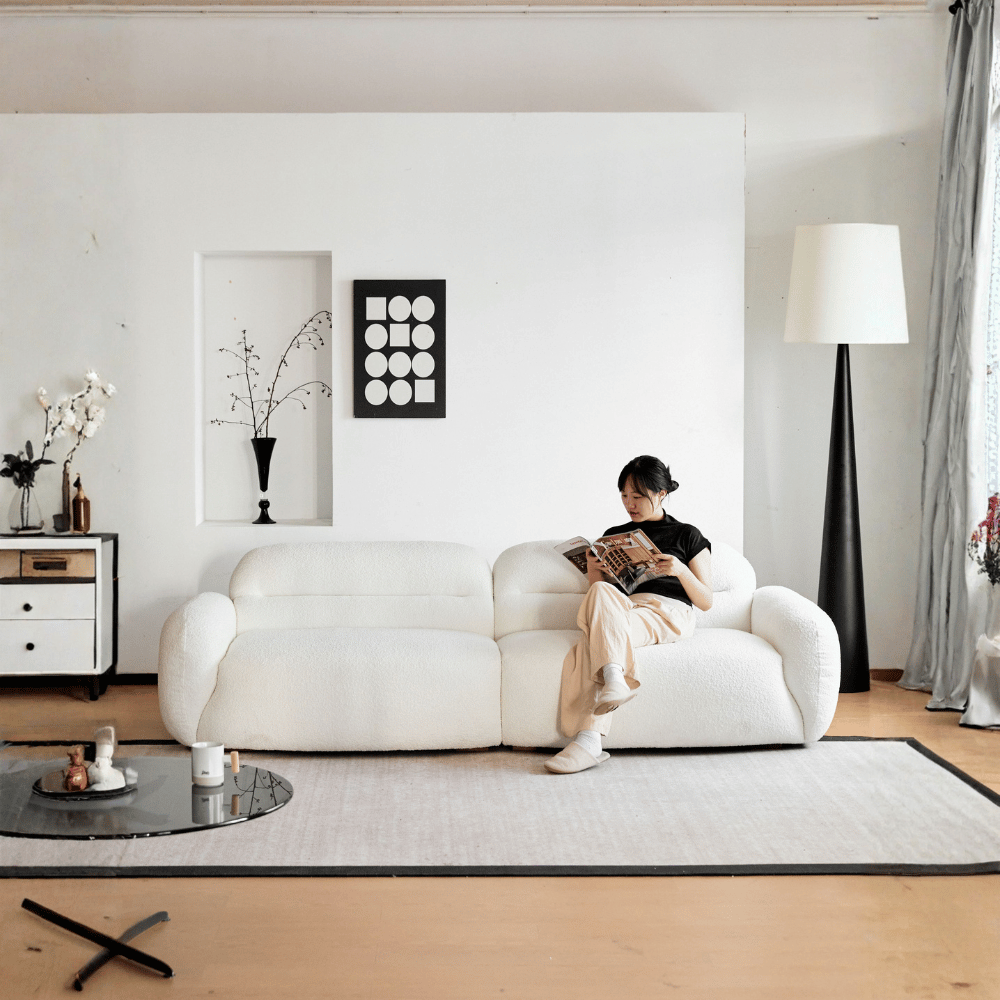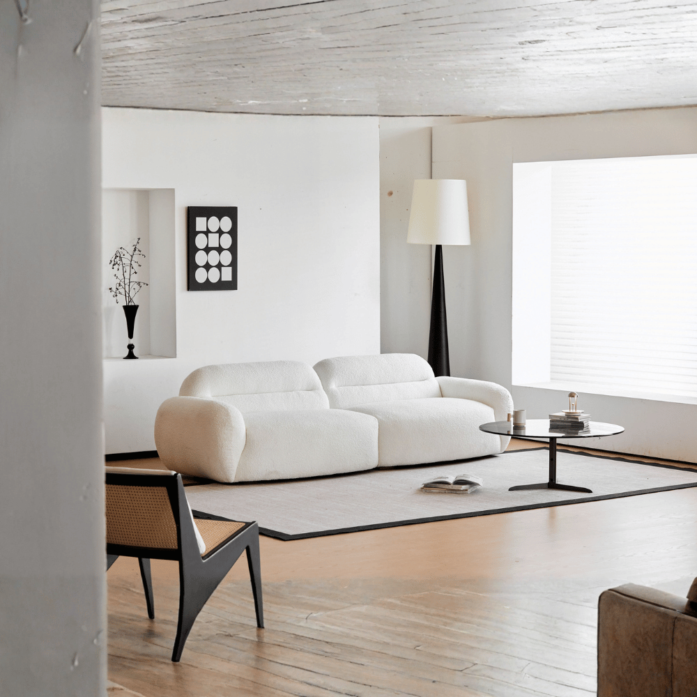 🌬️ Premium Texture-Rich Fabric Upholstered in high-GSM performance fabric (often bouclé or heavy-weave linen) that is soft to the touch and durable enough for daily use. The fabric is chosen to highlight the sofa's unique curves through soft shadows and highlights.