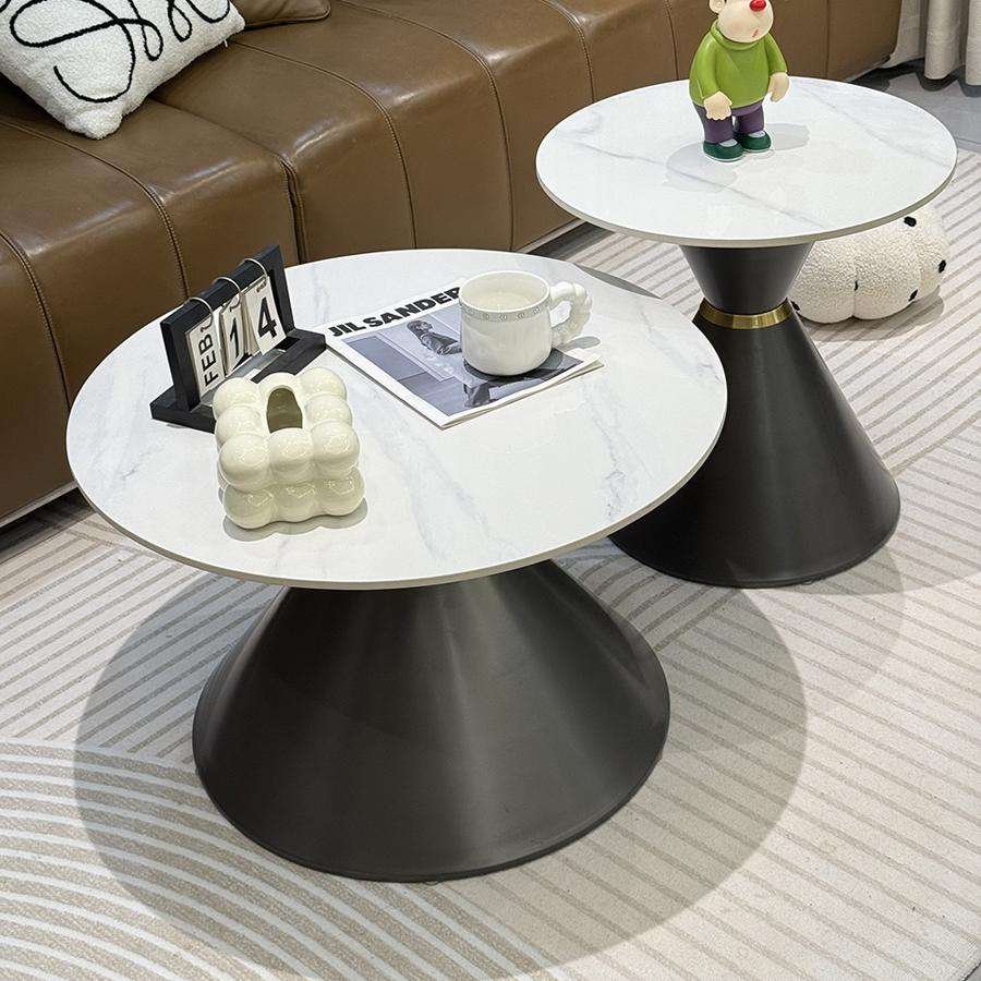 V01 – Modern Italian Design Dual Round Coffee Table Set – Rock Slab Top with Black Iron Base for Living Room