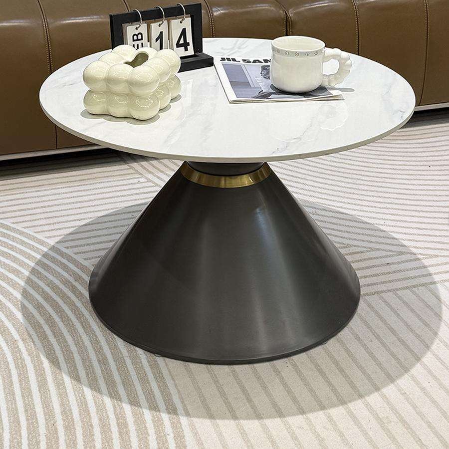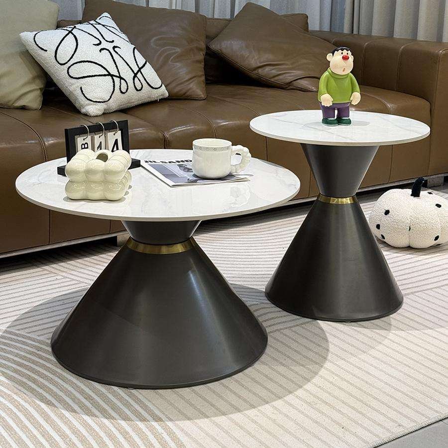 V08 – Modern Pair Round Coffee Table Set – Marble-Finish Rock Slab Tops with Iron Base for Living Room